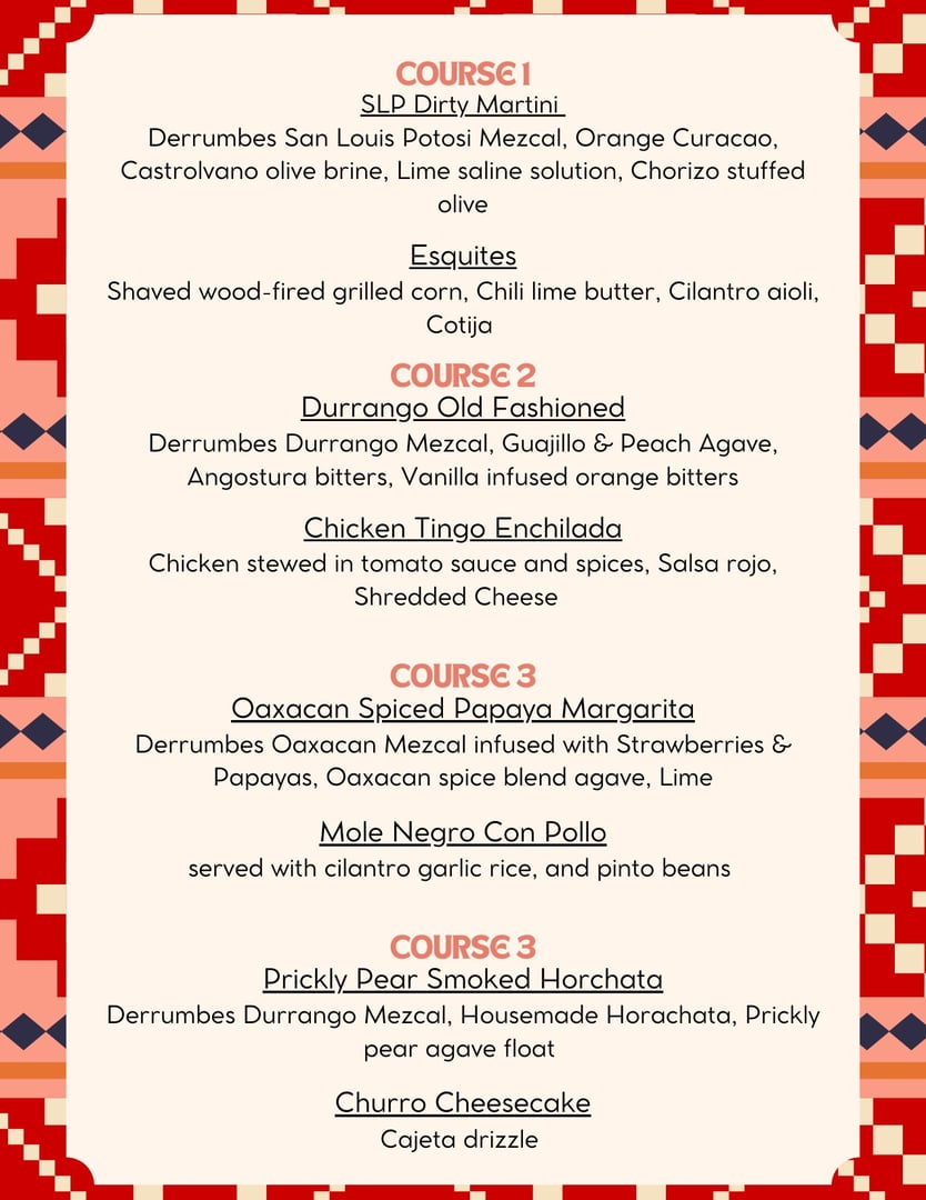 Our bar manager, Gabriel Ducharme, and our Executive Chef, Jordan Borlaza, have created a festive tasting menu showcasing the Derrumbes Mezcal distillery paired with innovative & exciting cocktails, while complimenting the Wood & Salt culinary concept.